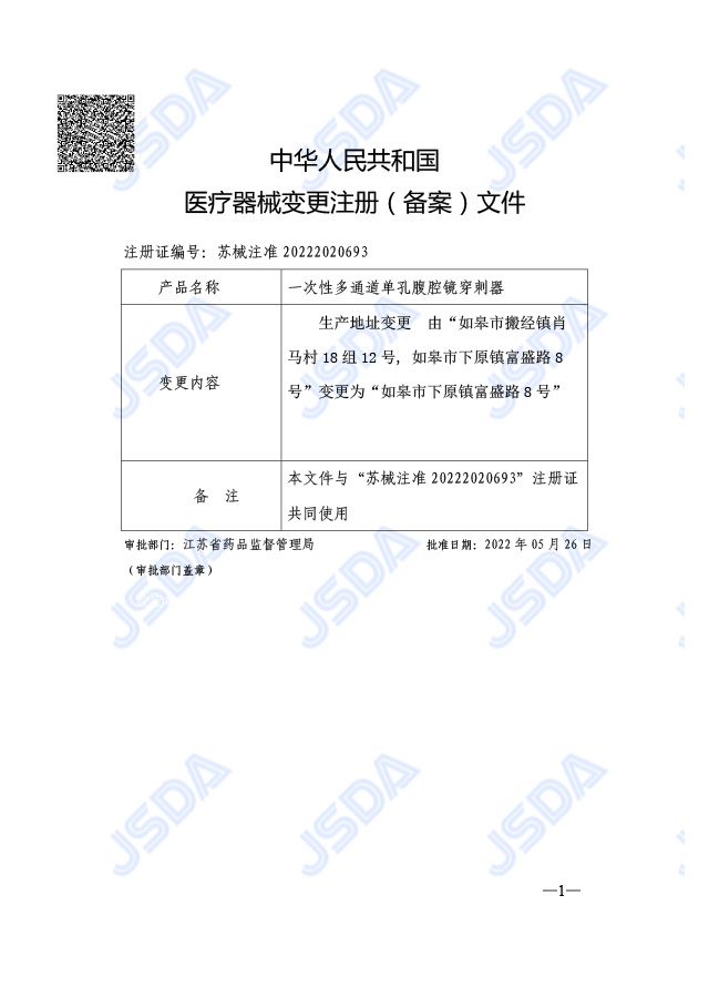 一次性多通道單孔腹腔鏡穿刺器注冊證變更